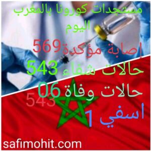 اخبار وطنية صحة مستجدات كورونا بالمغرب اليوم safimohit 23 مارس, 2021 Spread the love Please follow and like us: Continue Reading Previous: أسفي ترفض العنفNext: الانتخابات ونحن اترك تعليقاً إلغاء الردلن يتم نشر عنوان بريدك الإلكتروني. الحقول الإلزامية مشار إليها بـ *التعليق * الاسم * البريد الإلكتروني * الموقع الإلكتروني احفظ اسمي، بريدي الإلكتروني، والموقع الإلكتروني في هذا المتصفح لاستخدامها المرة المقبلة في تعليقي. مقالات ذات صلة بـيــــــــان صـحـفــــــي Oncorad Group تدشن بمدينة آسفي أكبر قطب استشفائي متعدد التخصصات بحوض دكالة-عبدة اخبار محلية بـيــــــــان صـحـفــــــي Oncorad Group تدشن بمدينة آسفي أكبر قطب استشفائي متعدد التخصصات بحوض دكالة-عبدة 16 أبريل, 2026 لقاء البرازيل يؤكد مجددا إرهابية البوليساريو اخبار وطنية لقاء البرازيل يؤكد مجددا إرهابية البوليساريو 7 أبريل, 2026 المغرب بلد الشرفاء لا مكان للعاقين فيه اخبار وطنية المغرب بلد الشرفاء لا مكان للعاقين فيه 11 مارس, 2026