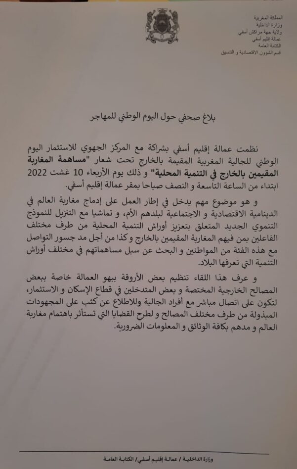 اخبار محلية اسفي : بلاغ صحفي حول اليوم الوطني للمهاجر safimohit 10 أغسطس, 2022 Spread the love Please follow and like us: Continue Reading Previous: أسفي: خصاص كبير في أدوية الأمراض العقليةNext: عامل إقليم اسفي يترأس مراسيم حفل الانصات للخطاب الملكي بمناسبة الذكرى الـ69 لملحمة ثورة الملك والشعب اترك تعليقاً إلغاء الردلن يتم نشر عنوان بريدك الإلكتروني. الحقول الإلزامية مشار إليها بـ *التعليق * الاسم * البريد الإلكتروني * الموقع الإلكتروني احفظ اسمي، بريدي الإلكتروني، والموقع الإلكتروني في هذا المتصفح لاستخدامها المرة المقبلة في تعليقي. مقالات ذات صلة وفاة شاب في العشرين من عمره بحي المحمدي في آسفي بعد تناوله لمشروب غازي بارد اخبار محلية وفاة شاب في العشرين من عمره بحي المحمدي في آسفي بعد تناوله لمشروب غازي بارد 17 أبريل, 2026 بـيــــــــان صـحـفــــــي Oncorad Group تدشن بمدينة آسفي أكبر قطب استشفائي متعدد التخصصات بحوض دكالة-عبدة اخبار محلية بـيــــــــان صـحـفــــــي Oncorad Group تدشن بمدينة آسفي أكبر قطب استشفائي متعدد التخصصات بحوض دكالة-عبدة 16 أبريل, 2026 العامل الفطاح يزور ورش مشروع تأهيل المدينة القديمة بأسفي اخبار محلية العامل الفطاح يزور ورش مشروع تأهيل المدينة القديمة بأسفي 8 أبريل, 2026