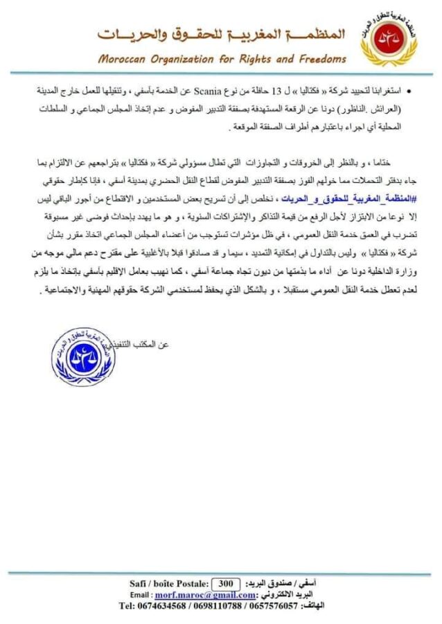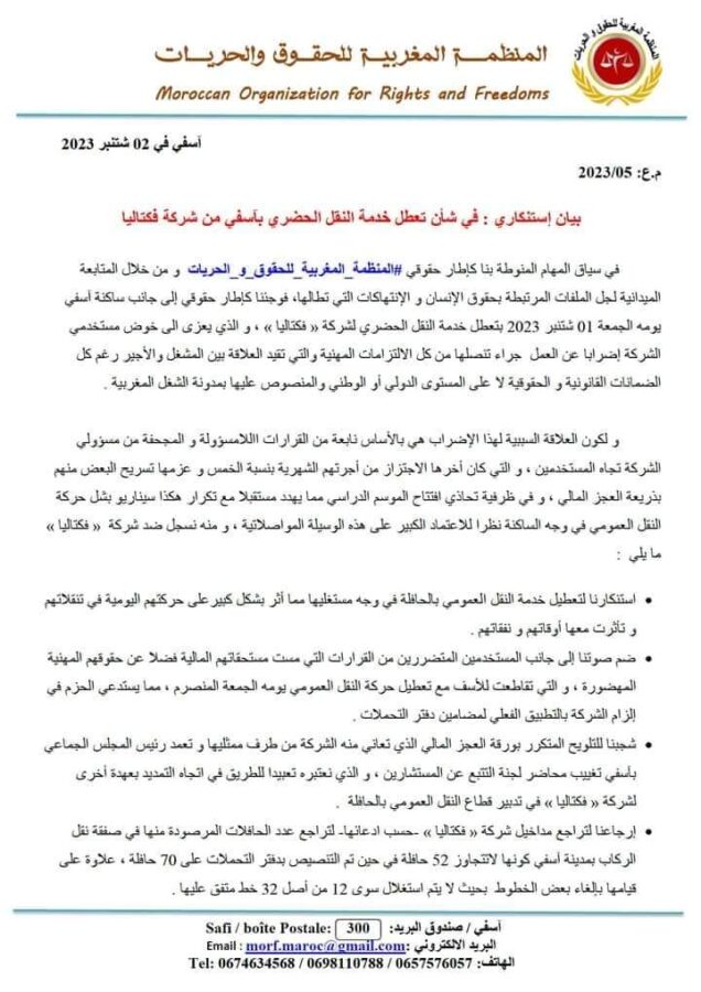 في سياق المهام المنوطة بنا كإطار حقوقي”المنظمةالمغربيةللحقوق والحريات”، و من خلال المتابعة الميدانية لجل الملفات المرتبطة بحقوق الإنسان و الانتهاكات التي تطالها، فوجئنا كإطار حقوقي إلى جانب ساكنة أسفي يومه الجمعة 01 شتنبر 2023 بتعطل خدمة النقل الحضري لشركة « فكتاليا » ، و الذي يعزى الى خوض مستخدمي الشركة إضرابا عن العمل جراء تنصلها من كل الالتزامات المهنية والتي تقيد العلاقة بين المشغل والأجير رغم كل الضمانات القانونية و الحقوقية لا على المستوى الدولي أو الوطني والمنصوص عليها بمدونة الشغل المغربية .