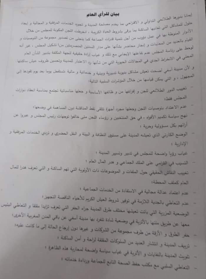 أصدر عدد من المستشارين بالمجلس البلدي بيانا أشاروا من خلاله إلى تفاقم أزمات المدينة على مستوى الطرقات المهترئة، وعلى مستوى التنمية والإصلاحات شبه المتوقفة، بالإضافة إلى تنامي ظواهر خطيرة من قبيل هدر المال واستغلال النفوذ، والترامي على الأملاك العامة.