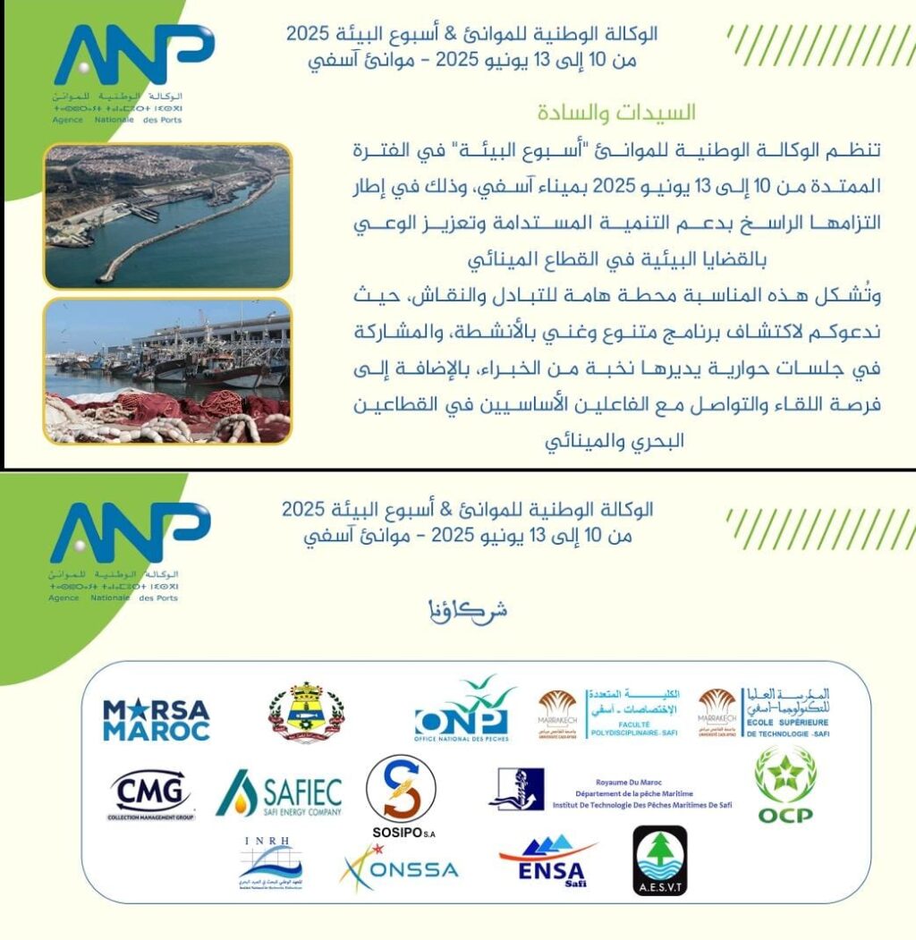 في إطار التزامها الراسخ بحماية البيئة وتعزيز التنمية المستدامة داخل الفضاءات المينائية، تنظم الوكالة الوطنية للموانئ – مديرية ميناء آسفي و الجهة، خلال الفترة الممتدة من 10 إلى 13 يونيو 2025، فعاليات أسبوع البيئة، تحت شعار: