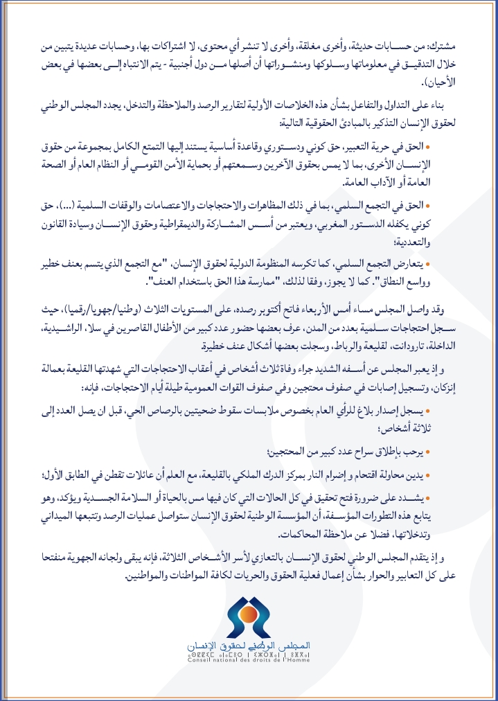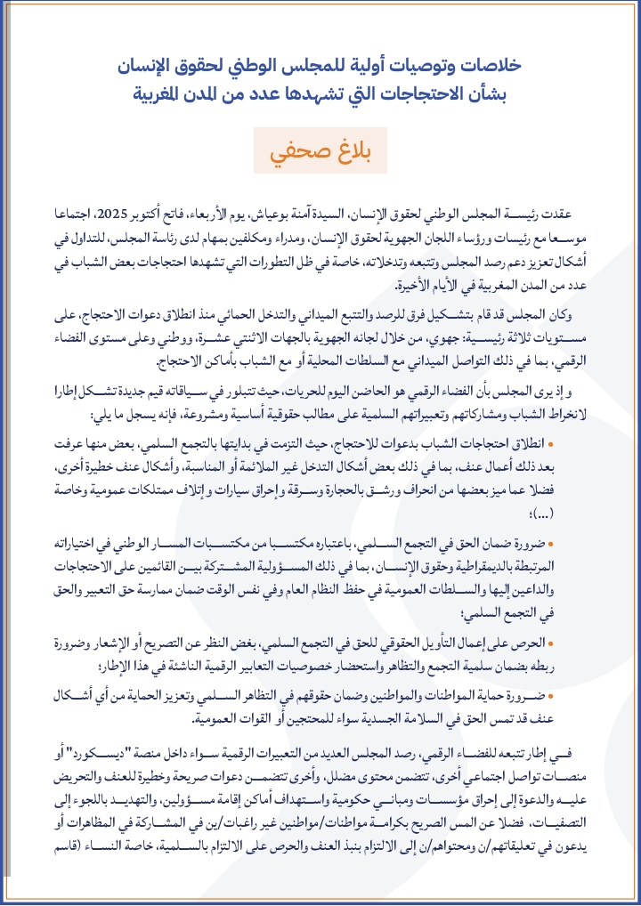 وختم المجلس الوطني لحقوق الإنسان بلاغه بالتأكيد على مواصلة الرصد الميداني والرقمي، والانفتاح على الحوار مع مختلف الفاعلين، بما يعزز ثقة المواطنات والمواطنين في أن ممارسة حقوقهم الأساسية لا تنفصل عن واجب السلمية والمسؤولية المشتركة في حماية الصالح العام.
